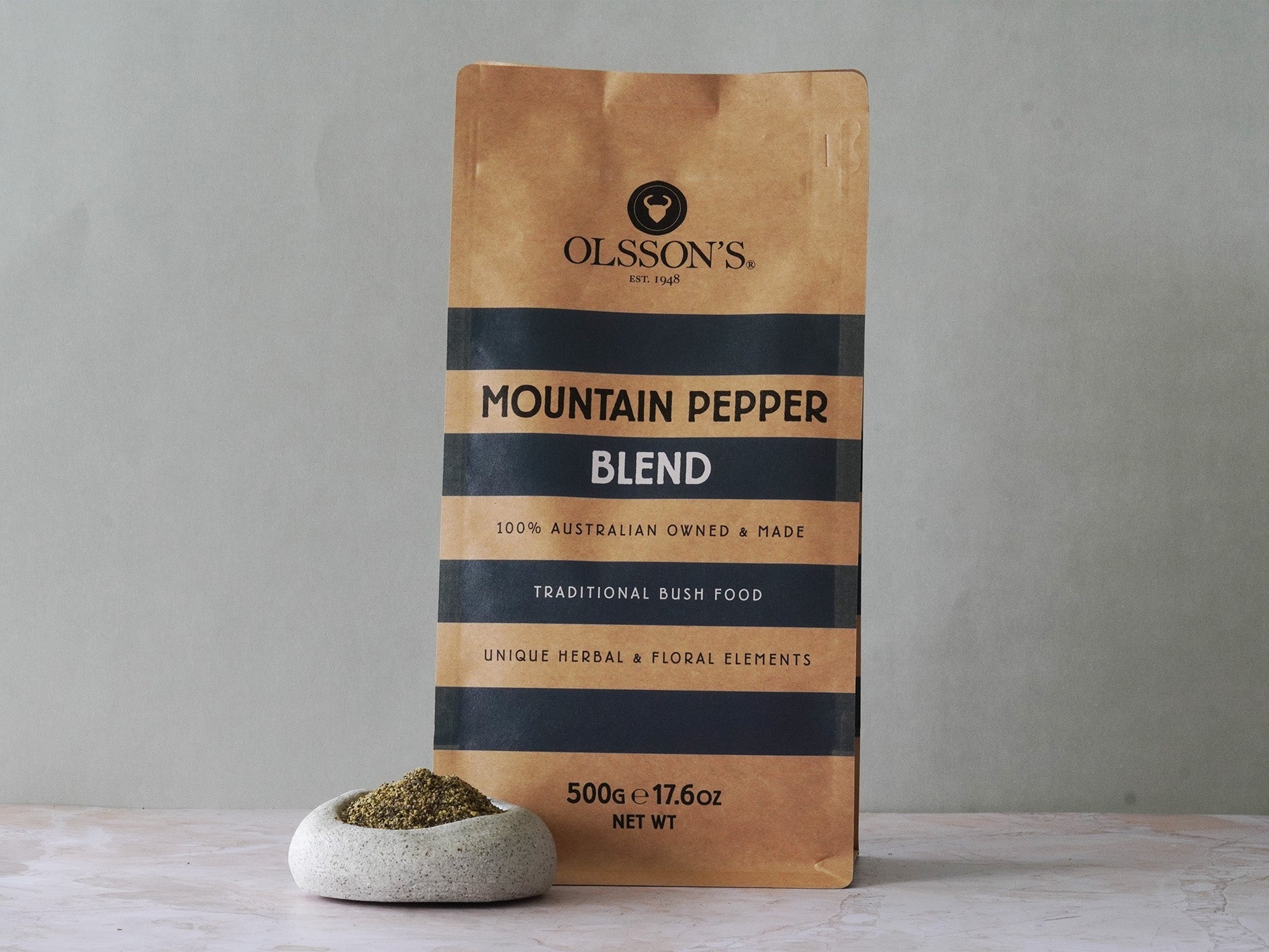 An aromatic blend of black cracked pepper with Mountain Pepper Leaf. Mountain Pepper Leaf is the savoury surprise of the Australian bush with an earthy, spicy flavour, complex floral elements and lingering mild heat.